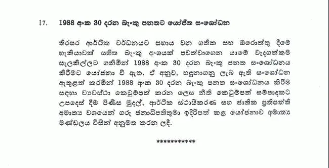 Videoගෞරව නාමයත් දුන් නා හිමි ආණ්ඩුවම ඔසවා පොළොවේ ගසයි JVPයේ මේගොල්ලෝ ත්රස්තවාදියෝ2025-10-29 Videoලබා දී තිබෙන ඇප අත්හිටුවන්න ඉල්ලුවා අධිකරණයට ගිය දේශපාලන ප්රබලයෝ එළියට ඇවිත් කී රටම හෙල්ලෙන කතාව2025-10-29 Videoහිඟන්නෝ ගෙනත් තනතුරු දුන්නම වෙන දේ ආන්දෝලනාත්මක හඬ පටය මෙන්න පොලිස්පතිගෙන් කොමිසමට පැමිණිල්ලක්2025-10-29 Videoවැලිගම පාතාලේ ප්රසිද්ධියේම එළියට මේක අන්තිම වතාව ඊළඟ පාර කපලා යවන්නේ සංචාරයකයෙකු සියල්ල පටිගත කරයි2025-10-29― political ―ගැමි දරුවෙක් රට පාලනය කරනවා දකිද්දී ආඩම්බරයි Dinuka - 2025-07-09 0 ගැමි දරුවෙක් රට පාලනය කරනවා දකින විට පක්ෂයක් ලෙස ඉතා ආඩම්බර වෙන බව ජනසෙත පෙරමුණේ නායක බත්තරමුල්ලේ සීලරතන හිමියෝ පැවසූහ.කොළඹ, පක්ෂ කාර්යාලයේදී පැවති මාධ්ය...ජාතික ජන බලවේගයේ පක්ෂ නායකයින් අද මැතිවරණ කොමිසම හමුවට 2025-02-19 0 අයවැය හොද නිසා දෙකෝටි විසි ලක්ෂයක් සතුටු කදුළු සලමින් හිනැහෙනවා 2025-02-18 0 අර්චුනාගේ මන්ත්රී ධුරය අහෝසි කරන්නැයි ඉල්ලූ පෙත්සමට අධිකරණයෙන් ලැබුණු නියෝගය 2025-01-31 0 Videoගෞරව නාමයත් දුන් නා හිමි ආණ්ඩුවම ඔසවා පොළොවේ ගසයි JVPයේ මේගොල්ලෝ ත්රස්තවාදියෝහිඟන්නෝ ගෙනත් තනතුරු දුන්නම වෙන දේ ආන්දෝලනාත්මක හඬ පටය මෙන්න පොලිස්පතිගෙන් කොමිසමට පැමිණිල්ලක්ලබා දී තිබෙන ඇප අත්හිටුවන්න ඉල්ලුවා අධිකරණයට ගිය දේශපාලන ප්රබලයෝ එළියට ඇවිත් කී රටම හෙල්ලෙන කතාවවැලිගම පාතාලේ ප්රසිද්ධියේම එළියට මේක අන්තිම වතාව ඊළඟ පාර කපලා යවන්නේ සංචාරයකයෙකු සියල්ල පටිගත කරයිFacebookTwitterPinterestWhatsApp HomeNewsබැංකු පනත සංශෝධනයට කැබිනට් අනුමැතිය බැංකු පනත සංශෝධනයට කැබිනට් අනුමැතියBy madyawediya2023-06-27169Tags:~බැංකු පනත1988 අංක 30 දරණ බැංකු පනත සංශෝධනය කිරීම සඳහා කැබිනට් අනුමැතිය හිමිව තිබෙනවා.නීති කෙටුම්පත් සම්පාදකට උපදෙස් දීම පිණිස මුදල්, ආර්ථික ස්ථායීකරණ සහ ජාතික ප්රතිපත්ති අමාත්යවරයා වශයෙන් ජනාධිපතිවරයා ඉදිරිපත් කළ යෝජනාවටයි මෙලෙස අනුමැතිය හිමිව තිබෙන්නේ.Previous articleකෝටි 11ක රත්තරන් ගුවන්තොටේදී රේගු භාරයටNext articleචීනයේ සහල් මෙරට වගා කරන්නැයි ඉල්ලීමක් Hot Newsදරුවන් නොමැති මව්වරුන්ට කාසල් රෝහලෙන් සුබ පණිවිඩයක් 2025-10-28 Hot Newsබලපත්ර නොමැතිව මැණික් ගැරූ සැකකරුවෙකු අත්අඩංගුවට 2025-10-28 Hot Newsබූස්ස බන්ධනාගාරයෙන් මතු වූ ජංගම දුරකථන 2025-10-28