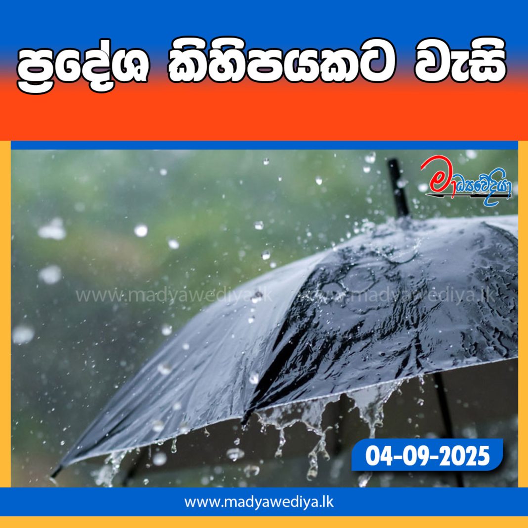 බස්නාහිර සහ සබරගමුව පළාත්වලත් ගාල්ල, මාතර, මහනුවර සහ නුවරඑළිය දිස්ත්රික්කවලත් වැසි ස්වල්පයක් ඇති විය හැකි බව කාලගුණ විද්යා දෙපාර්තමේන්තුව පවසනවා.