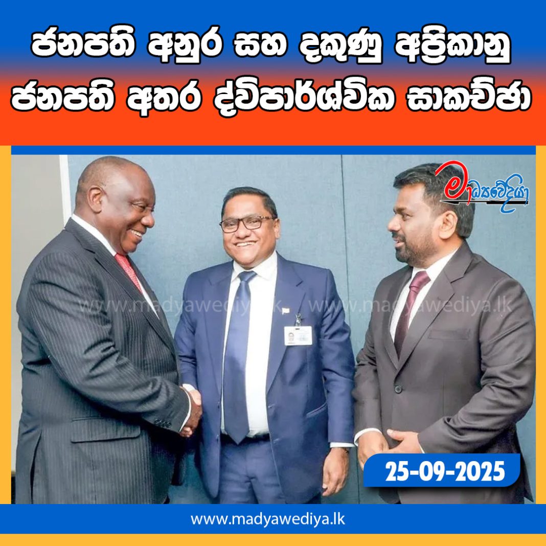 එක්සත් ජාතීන්ගේ මහා මණ්ඩලයේ 80 වැනි සැසිවාරයට සහභාගි වීම සඳහා ඇමරිකා එක්සත් ජනපදයට ගොස් සිටින ජනාධිපති අනුර කුමාර දිසානායක මහතා සහ දකුණු අප්රිකානු ජනාධිපති සිරිල් රමෆෝසා (Cyril Ramaphoza) මහතා අතර හමුව නිව්යෝර්ක් නුවර ONE Plazaහිදී පසුගියදා එක්සත් ජනපද වේලාවෙන් පස්වරුවේ පැවැත්විණි.