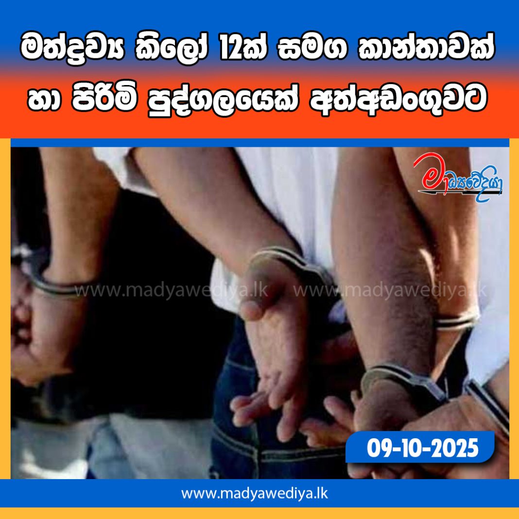 මත්ද්රව්ය කිලෝග්රෑම් 12ක් සමග කාන්තාවක් හා පිරිමි පුද්ගලයෙක් ඊයේ (8) පස්වරුවේ කඩවත පහළ බියන්විල ප්රදේශයේ දී නිවසක සිටියදී අත්අඩංගුවට ගෙන තිබෙනවා.